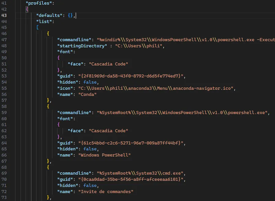 name: Mettez ce que vous voulez. J’ai mis “Conda”. N’oubliez pas la virgule en fin de lignehidden: Mettez “false,” car on veut voir ce profile. Il n’y a pas de guillemets mais il y a une virgule à la fin. Voir ci-dessus si besoin.guid: Il faut aller dans une session Powershell et taper “New-Guid”, copier l’id généré et le coller dans le profile. Toujours pareil, n’oubliez pas la virgule en fin de ligne.