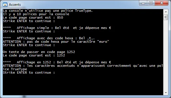 En effet, après vérification (ligne 79) l’application indique que la console utilise bien la page de code 1252 mais pourtant, lors de la sortie écran il n’y a rien de nouveau. Les ‘é’ et le ‘€’ ne sortent pas correctement. Qu’est-ce qui se passe ?