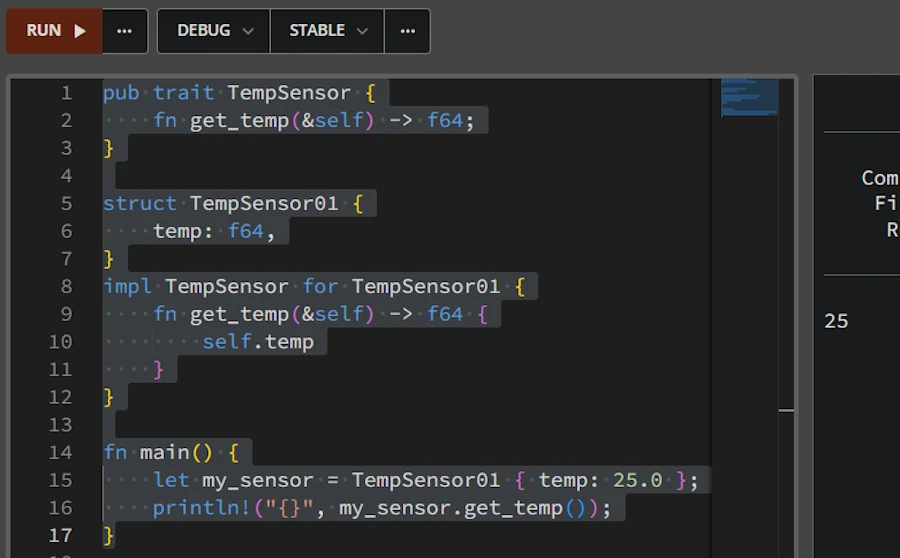 Note that the body is empty. Do you see the {}? The get_temp() is simply not yet defined for TempSensor02. When the monomorphization takes place, the default implementation will be used instead. This is what we can see in the terminal.