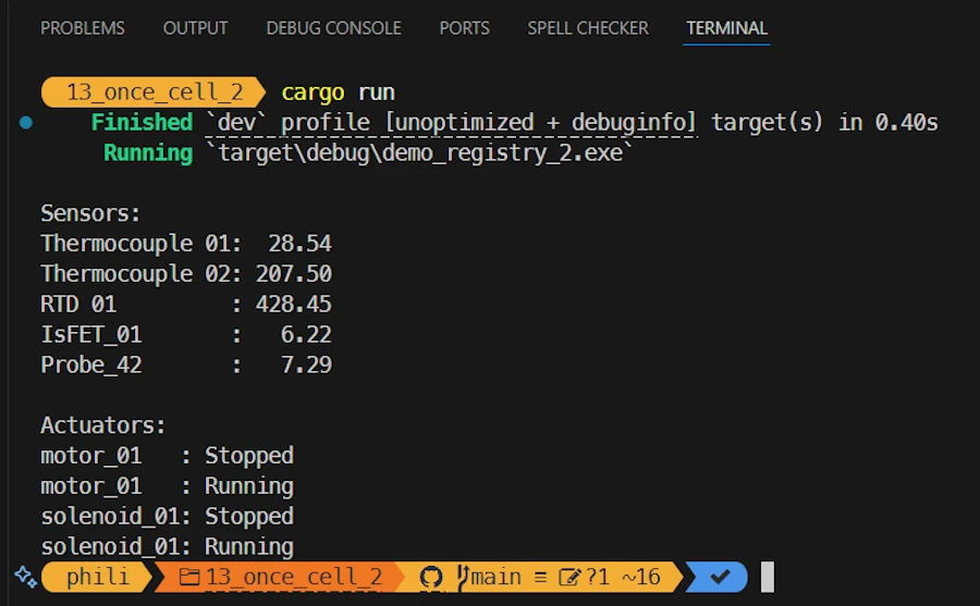 In main.rs we still have the sensors::register(); function call followed by actuators::register();. Then, as before, we instantiate the sensors. Finally we instantiate actuators (motor_01 and solenoid_01) with electric_actuator::make_actuator. We can act on actuators to turn the on and we can also read their status : this is done with the functions .get_state() and .set_state(true). This explain why at the bottom of the terminal we see motor_01 : Stopped when it is created then motor_01 : Running when it is turned on.