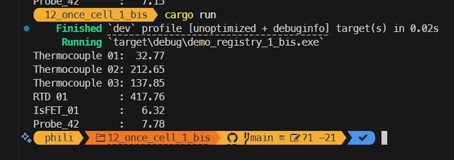 temperature,ph) has its own registry implemented withonce_cell::Lazy<Mutex<HashMap<...>>>. main()registers all sensors, then instantiates them by name viamake_sensor().- Having two registries allows faster lookups per family; alternatively, a single unified registry could be used.
