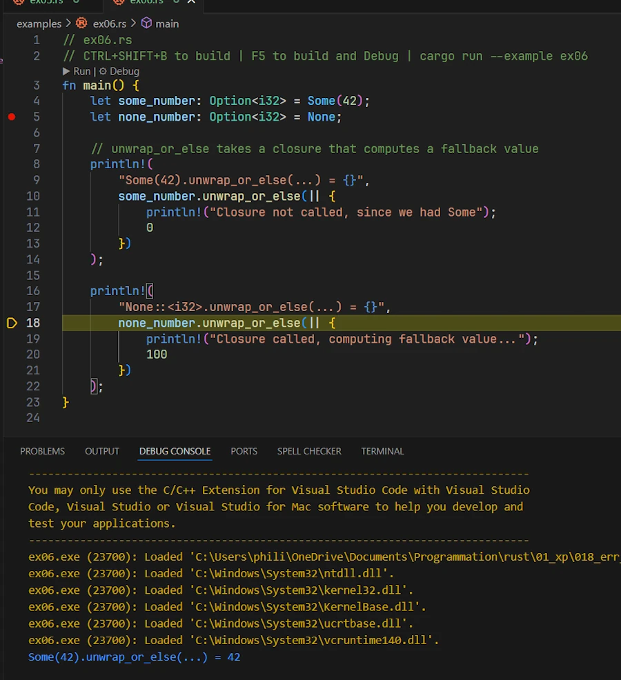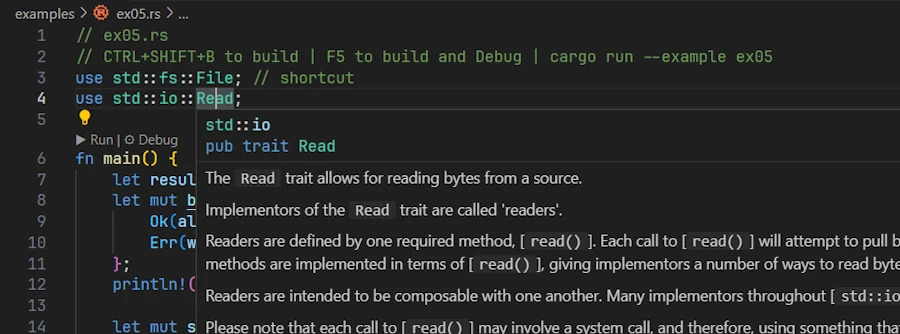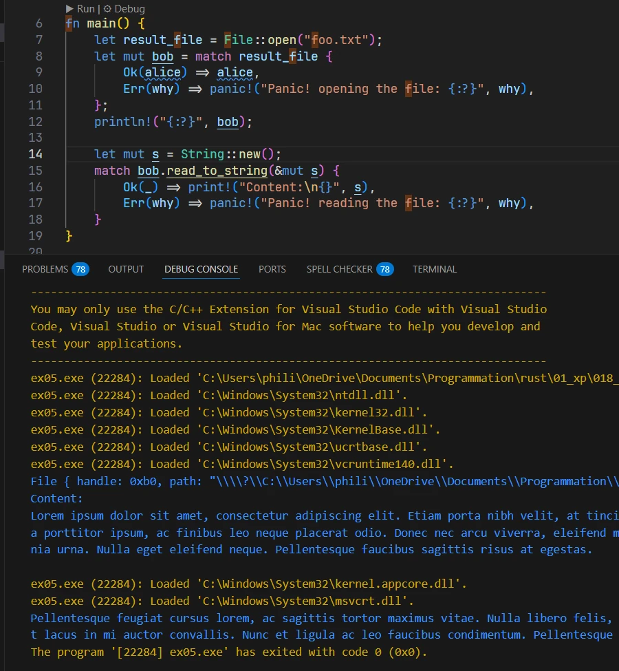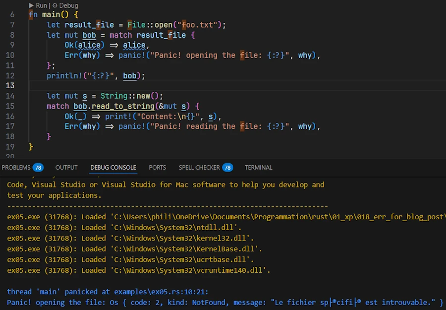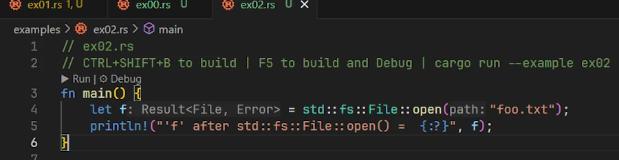 panic!()).- No exceptions are used. This language design decision helps prevent unchecked errors. We either deal with the error or deliberately choose to