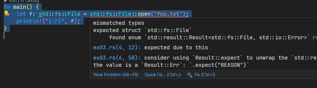 ?, if the error type of theResult<T, E>you’re handling doesn’t exactlymatchour function’s error type, it will attempt to convert it via theFromtrait. This allows different error types to be mapped into one error type for our function (for example, converting astd::io::Errorinto our custom error type). If no conversion is possible, you’ll get a type mismatch compile error, which we can resolve by using methods like.map_err()or implementingFromfor our error.main()can returnResult<T, E>: To use?at the top level, we can havemain()returnResult<(), E>. This way, anyErrthat propagates tomain()will cause the program to exit with a non-zero status and print the error. For example,main() -> Result<(), Box<dyn std::error::Error>>is a common choice to allow using?inmain()- Let’s keep this snippet in mind