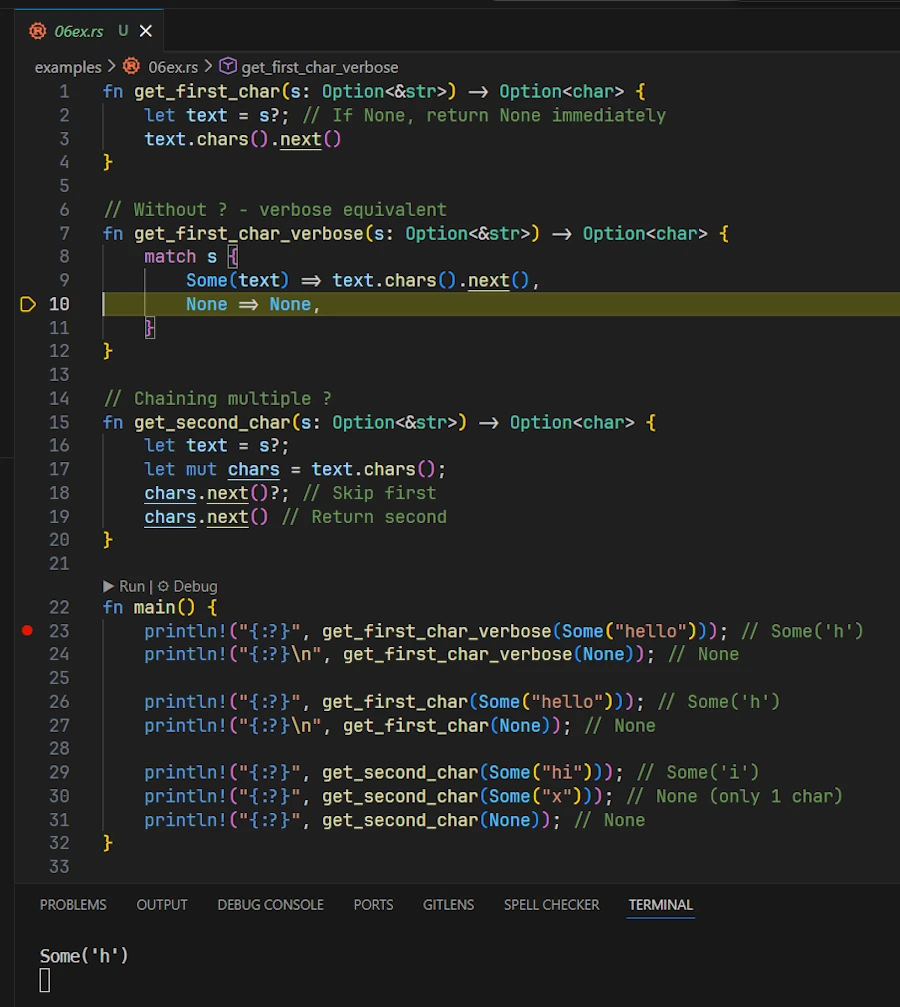 println!("{:?}", get_first_char_verbose(Some("hello"))); // Some('h')