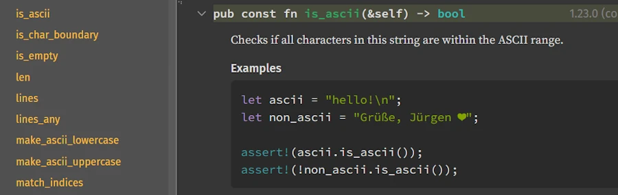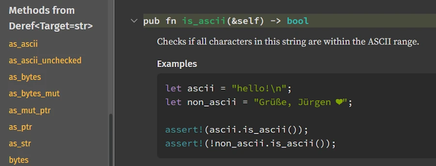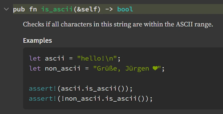 my_string.is_ascii(), but the docs showpub fn is_ascii(&self) -> bool. That&selfparameter? It’s the thing before the dot, but you’d never guess that from looking at the signature. - We think in concrete types; docs speak in generics — Our code says
