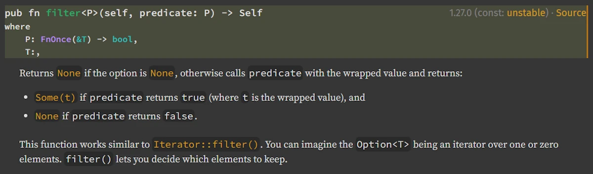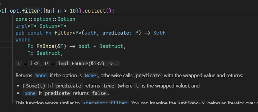 where P: FnOnce(&T) -> bool + Destructfeels like reading a legal contract when all you wanted was “pass a closure that returns true or false.” - Lifetimes appear out of nowhere — The docs show
