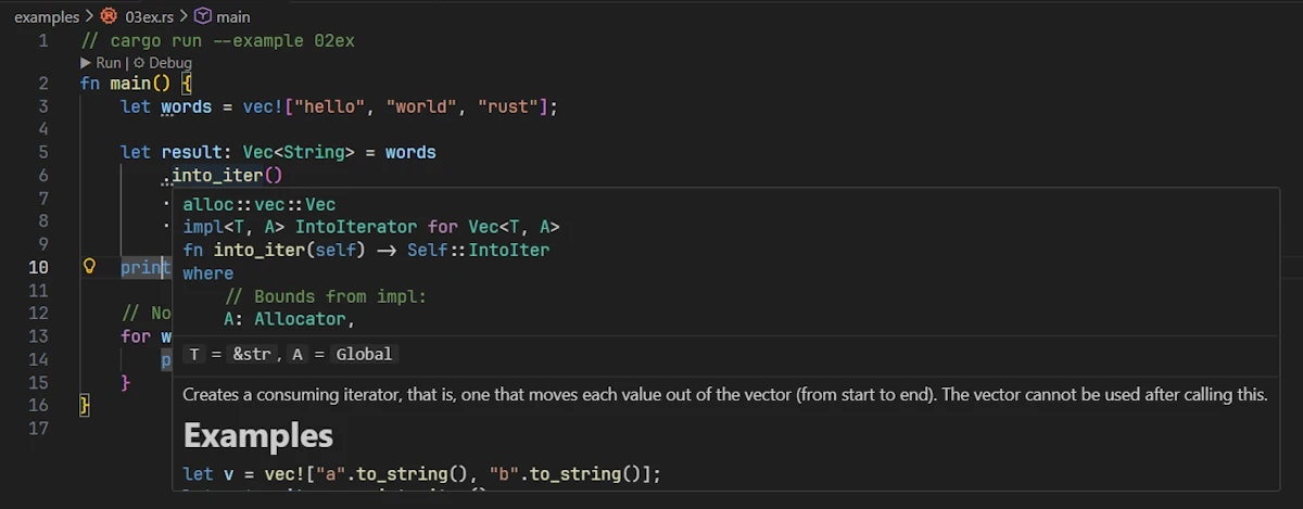Hover over vec! and you’ll see a tooltip from rust-analyzer. It’ll show you something like: