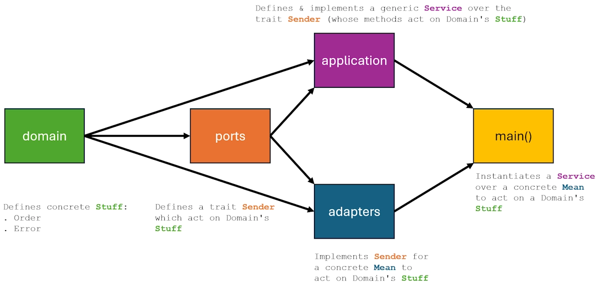 Note that in the module adapters we depend on domain and ports because we implement a trait defined in ports which act on objects defined in domain (Order for example)