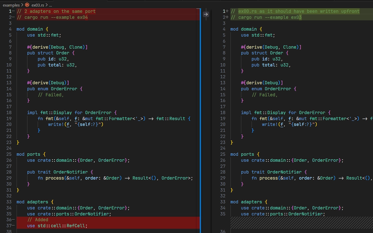 Open ex06.rs and if you want to compare the changes with one of the previous examples, select ex03.rs. The domain module remains the same but the ports module now hosts a new port, the trait OrderRepository: