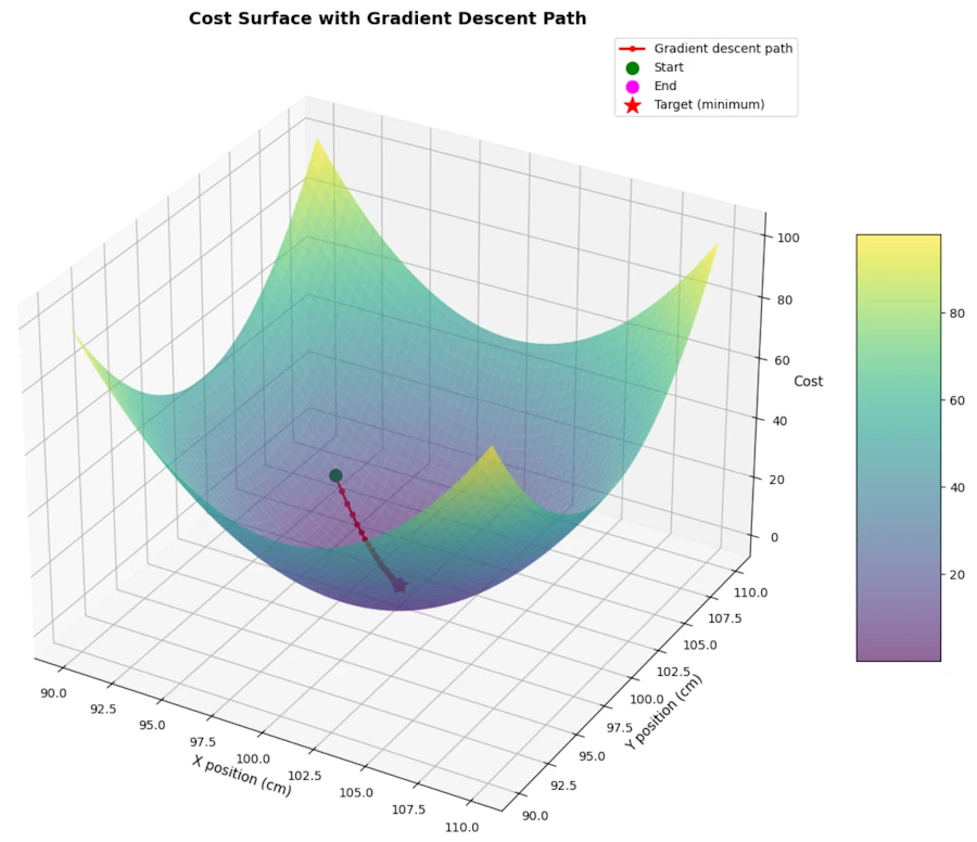 - Update: \(x\_laser\_new = x\_laser\_old - \alpha \cdot gradient\_x = 95.5 - 0.1 \cdot (-4.5) = 95.5 + 0.45 = 95.95\) cm