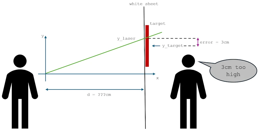 You take your first shot. Your laser dot appears at some random height \(y\). Your friend shouts: “error = 3 cm” (too high).