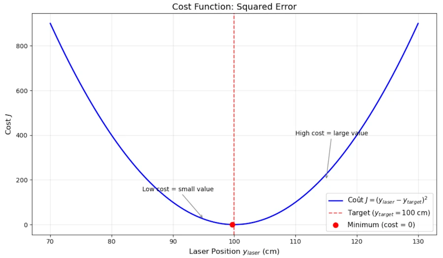 So, we have our cost function, \(J = (y\_laser - y\_target)^2\). Imagine we graph this. Since the only thing changing is y_laser, we get a simple U-shaped curve because \(J = (y\_laser - y\_target)^2 \approx (x - k)^2 \approx x^2\). This is nothing else than a parabola where the bottom of the “U” is right where y_laser equals y_target— that’s our bullseye, where the cost is zero.