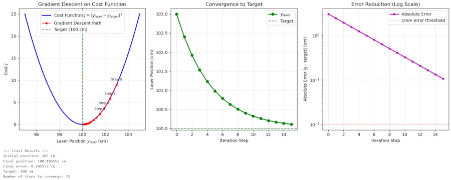 - If you start with y_laser = 97 cm (below the target at 100 cm), will the gradient be positive or negative? In which direction will the laser move after the update?